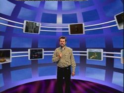 Selbst erstellte virtuelle Umgebungen für Videoproduktionen erlauben maßstabsgerechte Ergebnisse. Das Beispiel zeigt die Variante einer Moderation mit beweglichem Hintergrund, bei der live ein Umschnitt auf eine andere Kameraperspektive erfolgen kann. |